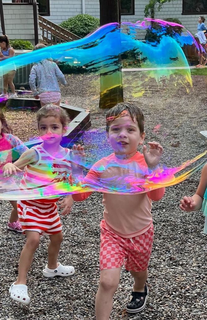 Our playground offers a very large fenced-in area which includes several playsets and lots of space to climb. There are sunny and shady areas, a large playhouse, a huge sandbox and a large tire for climbing and class gatherings.